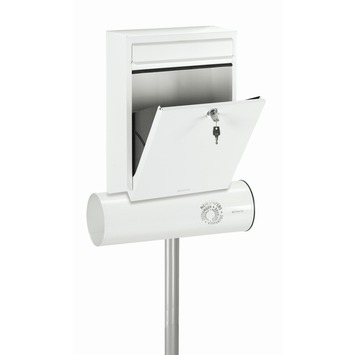 De Brabantia B100 is een groot formaat brievenbus, geen overvolle brievenbus meer. Door de opvangbak valt post niet op de grond. Met het cilinderslot en de 2 gecodeerde sleutels is de Brabantia B100 brievenbus te openen. Geschikt voor bevestiging aan een muur of op een paal.