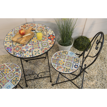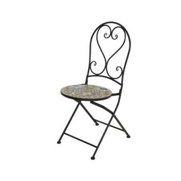 Wat meteen opvalt aan deze bistrostoel is het stijlvolle mozaïek van steen in de zitting. Een decoratief accent dat niet alleen mooi oogt, maar ook verrassend stevig zit. De Braga bistrostoel is gemaakt van zwart ijzer en heeft een afmeting van 50 x 39 x 93 cm. Hij voelt solide aan en past perfect op een balkon, terras of in een knusse tuinhoek. Je combineert deze stoel moeiteloos met de bijpassende bistrotafel uit dezelfde lijn. Of je nu buiten ontbijt of ’s avonds een glas wijn drinkt: met deze stoel zit je altijd goed — letterlijk én qua uitstraling.