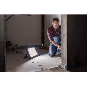 Mobiele Brennenstuhl LED bouwlamp DINORA 5000 - 50W. Comfortabel, niet-verblindend werklicht met bijzondere lichtspreiding voor buitengewone verlichting. Perfect voor industrieel gebruik en voor de veeleisende vakman door de hoge beschermingsgraag IP65. De lamp is uitermate licht van gewicht 2,5KG en toch extreem robuust. Door de geringe warmteontwikkeling, bestaat er geen verwondingsgevaar en behoud je extra lange levensduur van de LED's. De SMD-LED's zijn bestand tegen vibratie en schokken. De behuizing is van slag- en stootvast kunststof en bevat tevens rubberen zijkantbescherming. De regelbare steunklem is praktisch ontworpen voor montage op de grond of op een telescopisch statief. Het design is zo ontworpen dat hij eenvoudig transporteerbaar is mede door zijn comfortable draaggreep. De verlichte aan/uit-schakelaar is ideaal als je de lamp wilt gaan gebruiken terwijl het al donker is. Dit armatuur bevat ingebouwde LED-lampen en kunnen niet vervangen worden. Met een lengte van 5 m neopreenkabel heeft jevoldoende bewegingsruimte om de lamp te verplaatsen. De LED's hebben een capaciteit van 47 Watt en een lichtstroom van 5000 lm. Met een lichtefficiëntie van 107 lumen per Watt en een kleurtemperatuur van 5800 kelvin geeft hij veel, helder en werkbaar licht, ideaal bij b.v. het schilderen. Energie efficiëntieklasse: A++.