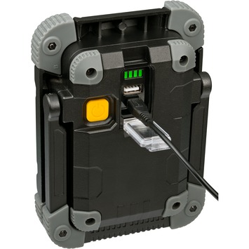Accu LED-werklamp 10 W IP 54. Flexibel inzetbare, accu werklamp voor gebruik binnen- en buitenshuis, IP54. Altijd helder werklicht, ook op plaatsen zonder netstroom. Spatwaterbestendig. Inclusief batterij indicator, en geïntegreerde ontladingsbeveiliging. Met aan/uit-schakelaar. 2 Schakelniveaus : 100 % en 50 % licht (voor langere duurzaamheid van de verlichting). Powerbank-functie: USB-laadingang voor apparaten met USB-laadkabel, zoals smartphones, mp3-spelers, tablets enz. Opladen via micro-USB-ingang (5 V, 1 A), USB-laadkabel inbegrepen. Behuizing van gegoten aluminium, randbescherming van hoogwaardige kunststof. Stoot- en valbestendig tot een hoogte van 2 m. Stabiel, trapsgewijs uitklapbaar frame. Met vormgegeven, robuuste tas voor een veilig transport. Deze armatuur bevat ingebouwde LED-lampen. In de armatuur kunnen de lampen niet worden vervangen. Capaciteit: 10 W. Lichtstroom: max.1000 lm. Lichtduur: h 3 uur (100 %) / 6 uur (50 %). Accu: Li-Ion 3,7 V / 4400 mAh. Kleurtemperatuur: 6500 K.