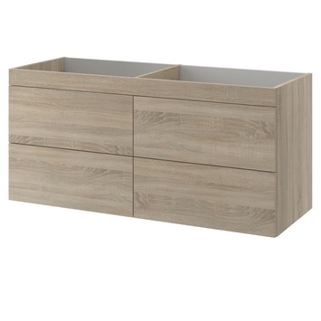 Deze onderkast van Bruynzeel Elements van 120 cm breed en 45 cm diep biedt ruimte aan 2 wasbakken. De kast is uitgevoerd in dubbel grijs eiken en heeft 4 laden. Dat biedt ieder gezinslid veel ruimte voor handdoeken en toiletspullen. Omdat de kast wordt opgehangen, geeft dat een ruimtelijke uitstraling.