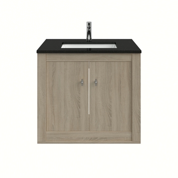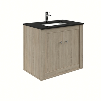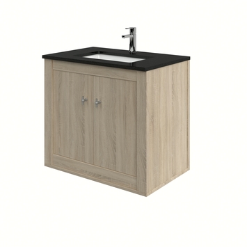 Dit badkamermeubel bestaat uit de volgende onderdelen: Hangende onderkast met softclose deuren Wastafelblad van zwart natuursteen met porseleinen kom . In de Heros serie worden klassieke met strakke lijnen gecombineerd. De combinatie van graniet met keramiek in het wastafelblad combineert uitstekend en geeft het meubel een authentieke look. Het wastafelblad is leverbaar met vierkante of ronde waskom. Dit meubel is zowel staand als hangend leverbaar. Maten Verkrijgbaar in de breedtemaat 80 cm. Kleuren Deze serie is verkrijgbaar in de kleuren: De onderkasten worden voorgemonteerd geleverd en zijn eenvoudig te installeren met de montageinstructie en de online klusvideo.