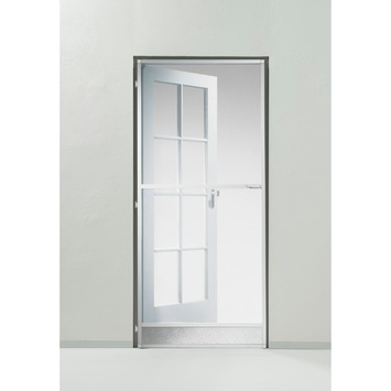 De vaste hordeur 500 serie is een complete set waarmee u een vaste hor kunt maken die u scharnierend op uw kozijn kunt plaatsen. Geschikt voor naar binnen en naar buiten draaiende deuren. De hoogte en breedte is eenvoudig aan te passen aan de maten van uw kozijn. De hor is uitgevoerd met witte aluminium profielen en een schopplaat.