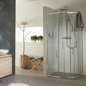 De Bruynzeel Lino kwartrond douchecabine 90x195 cm (radius 55) is geschikt voor montage in een hoekopstelling. Door zijn afmetingen in combinatie met schuifdeuren is deze cabine zeer geschikt voor het inrichten van een badkamer met beperkte ruimte. De twee schuifdeuren gaan soepel open en dicht dankzij de tandemrollers die los kunnen worden geklikt zodat de moeilijk bereikbare plekken makkelijk kunnen worden schoongemaakt. Deze kwartrond heeft een verstelbaarheid van 86,5 tot 88,5 cm. Te plaatsen op een douchebak, dorpel of direct op de tegelvloer.
