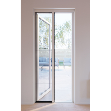 De Bruynzeel plisséhordeur S900 O 96x236–239 cm wit houdt insecten buiten en laat frisse lucht binnenstromen. Het zwarte geplisseerde gaas blijft in elke positie staan en vouwt zich netjes op in de aluminium cassette bij het sluiten. De smalle profielen zorgen voor een moderne en strakke uitstraling.