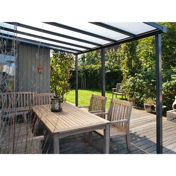De terrasoverkapping bestaat uit antracietkleurige aluminium profielen en meerwandige polycarbonaat dakplaten met een dikte van 10mm. De overkapping is 306cm breed, 310cm diep. En de staanders zijn 225cm hoog.