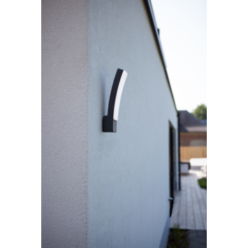 De Kira outdoor led wall lamp, met een gebogen en frameloze kop, verspreidt een homogeen wit licht (4000k) om muren, paden en andere open ruimtes rondom uw huis te verlichten.