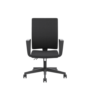 De stoel heeft vaste armleuningen en heeft een onderstel met wielen geschikt voor zachte ondervloeren. De bureaustoel is in hoogte verstelbaar.