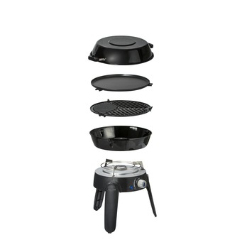 Deze veelzijdige, lichtgewicht gasbarbecue weegt slechts 4kg en wordt geleverd met vier verwisselbare kookoppervlakken; Een brander met pandrager, een BBQ rooster, een bakplaat en een een pan die tevens als deksel te gebruiken is.