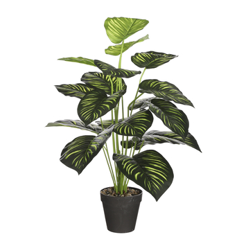 Fleur je huis of terras op met deze prachtige donkergroene Caladium-sierplant van Mica Decorations! Daar waar deze Zuid-Amerikaanse plant normaalgesproken seizoengevoelig is kan je er nu het hele jaar door van genieten. De plant is gemaakt van kunststof, niet giftig en dus veilig voor kinderen en huisdieren. De bladeren zijn voorzien van frisse donkergroen getinte lijnen die direct in het oog springen en voor een extra dimensie zorgen in z'n omgeving. Hij wordt geleverd in een stevige kunststof bloempot waardoor je hem direct een mooie plek kan geven. Overzetten in een stijlvolle overpot is ook een optie. De kunstplant is ongeveer 80 cm hoog en heeft een diameter van 50 cm.