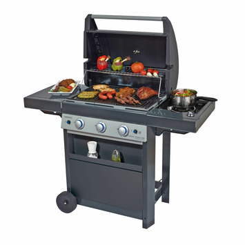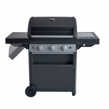 Een uitgebreide buitenkeuken voor de hele familie. De Campingaz gasbarbecue 3 series classic LBS metaal zwart 60x53 cm heeft drie afzonderlijk regelbare branders, zodat je eenvoudig verschillende soorten ingrediënten op de juiste temperatuur kunt bereiden. Sauzen en bijgerechten bereid je eenvoudig op de zijbrander. Dankzij het piëzo-ontstekingsmechanisme heb je de BBQ met een druk op de knop aan. De Even Temp-technologie zorg voor een gelijkmatige warmteverdeling. Via de thermometer die in de deksel is ingebouwd zie in je een klap hoe hoog de temperatuur in de BBQ is zonder de deksel te openen. Door de twee wielen kun je deze barbecue eenvoudig door je tuin rijden. Het rooster heeft een afmeting van 63x45cm. Kortom: een grote barbecue voor lange zomeravonden buiten tafelen.
