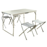 Inklapbare campingtafel met 4 inklapbare krukjes, de krukjes zijn op te bergen in de tafel zodat deze gemakkelijk vervoerd kan worden. De tafel is in hoogte verstelbaar: 55 – 62 en 70 cm. Afmeting tafelblad (lxb): 120x60 cm. Afmeting krukjes (lxbxh): 35x30x35 cm.