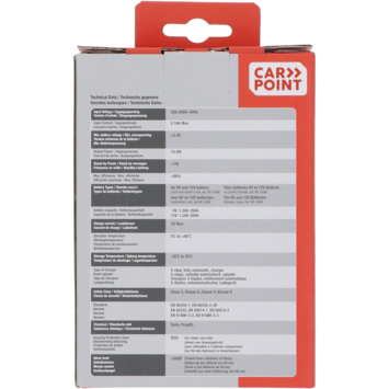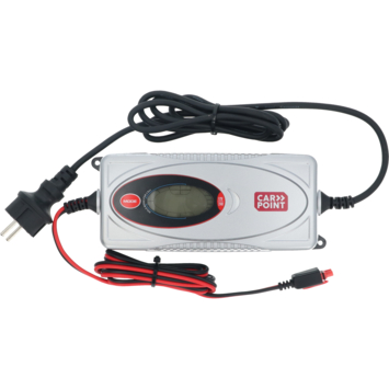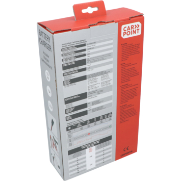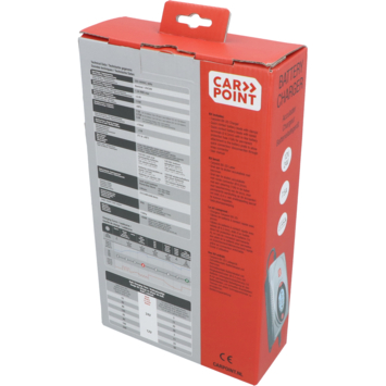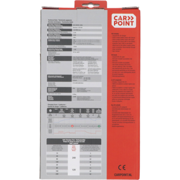 Deze Carpoint BX-2D acculader is geschikt voor het opladen van 12 en 24 Volt met 10 tot 240 Ampère oplaadbare loodaccu’s en 10-80 Ampère lithiumaccu’s.  De acculader doorloopt een volautomatische oplaadcyclus in 8  stappen. Diagnose fase, controleert de toestand van de accu en/of deze de lading kan accepteren. Herstel en zacht begin fase, herstelt ernstig ontladen accu’s  van meer dan 2 Volt onder lage laadtoestand of pulsladen. Snelladen faseHerstelt sterk ontladen accu’s met hoge laadspanning. Bulk fase, maximale laadstroom van 80% van de energie wordt geladen. Absorptie fase, laden tot bijna 100% wordt bereikt. Analyse fase, controle van de toestand van de lading. Zweef fase, accu volledig opgeladen en wordt op maximaal niveau gehouden met lage laadstroom. Maximale laadstroom 7.5 Ampère. De CP-2D acculader wordt geleverd met twee verschillende kleur gecodeerde kabels. Één kabel uitgerust met accuklemmen voor het laden van ontkoppelde accu’s en één kabel met oogaansluitpunten (Ø6.3mm) en 10 Ampère zekering voor permanent aangesloten accu’s . Beide kabels zijn voorzien van een snelkoppeling. Duidelijke display met: mode toets om te schakelen tussen verschillende soorten accu’s en ampère, snellaadstand.  Controle indicatie lampjes voor foutmeldingen en omgekeerde polariteit en voedingmodus. Indicatie lampjes voor volledig opgeladen of klaar voor gebruik. * Technische gegevens: * Ingangsspanning wisselspanning: 220-240VAC 50Hz * Uitgangsspanning: Nominaal: 12V/24V * Ingangsstroom: Maximaal 1,33A RMS * Minimale accuspanning: >2,0V * Uitgangsvermogen: 110W * Rendement: 80% * Laadstroom: 7.5A 12 Volt accu / 3.75A 24 Volt accu /5A voor 13.6V Voeding  * Terugvloeiende stroom: <10 mA * Stand-by-vermogen: < 1W * Omgevingstemperatuur: 0°C tot 40°C * Type Oplader: Acht stappen, volledig automatisch, opladen in verschillende modi * Soorten accu's: 12V herlaadbare zuur-loodaccu's (WET, MF, VRLA, AGM en GEL en Calcium) Lithium: 12.8V, 4 cellen LiFePO4 * Accucapaciteit: Zuur-loodaccu’s 12Volt 18-240Ah / 24 Volt 10-120Ah / Lithium 10-80Ah  * Afmetingen (l x b x h): 219,3x90,8x60,8mm * Bescherming behuizing: IP65 (stof- en spatvrij) alleen voor binnenshuis gebruik * Gewicht: 0.95kg * Geluidsniveau: <50 dB (getest op een afstand van 50 cm)