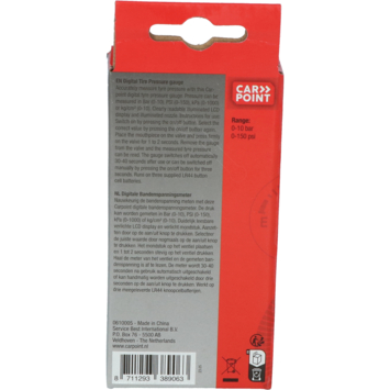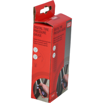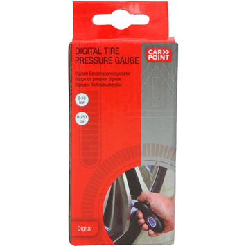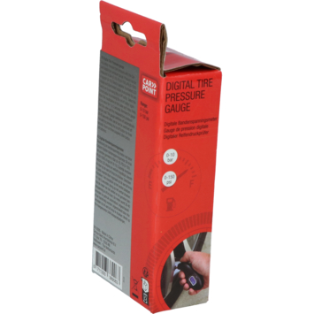 Met de Carpoint digitale bandenspanningsmeter kun je eenvoudig én nauwkeurig controleren of je banden nog op de juiste spanning zijn. Dit compacte apparaatje meet de druk in vier verschillende eenheden: Bar (0-10), PSI (0-150), kPa (0-1000) en kg/cm² (0-10). Het heldere verlichte LCD-display en de verlichte meetkop maken het mogelijk om ook in het donker met gemak af te lezen wat de spanning is. De bediening is intuïtief: druk op de aan/uit-knop om het apparaat te activeren en kies met een extra druk op de knop de gewenste meeteenheid. Plaats de meter kort op het ventiel en je ziet direct het resultaat. De meter schakelt zichzelf automatisch uit na ongeveer 30 tot 40 seconden, of handmatig met een druk van drie seconden. Inclusief drie LR44 knoopcelbatterijen. Door regelmatig te meten, voorkom je onnodige slijtage, verbeter je de veiligheid én bespaar je op brandstofverbruik.