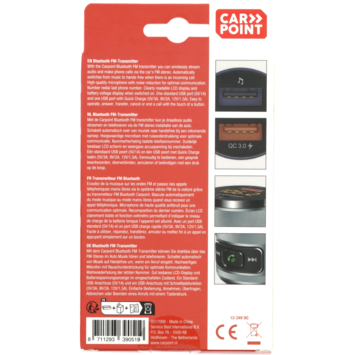 Maak van je standaard autoradio een modern Bluetooth-systeem met deze Carpoint FM transmitter. Stream draadloos je favoriete muziek en voer telefoongesprekken handsfree via je FM-installatie. De hoogwaardige microfoon met ruisonderdrukking zorgt voor kraakheldere gesprekken. Bij een oproep schakelt het apparaat automatisch van muziek naar bellen. Met functies als nummerherhaling, accuspanningcontrole, en duidelijke bediening via het LCD-scherm ben je altijd in controle. De transmitter beschikt over een normale USB-poort én een Quick Charge-aansluiting voor snel opladen van mobiele apparaten. Eenvoudig, compact en geschikt voor elk voertuig met een 12V of 24V aansluiting.