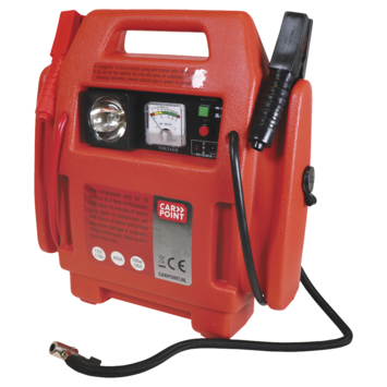 Startbooster en compressor in één. Start 12V voertuigen zonder gebruik te maken van een ander voertuig of netstroom. Jumpstarter met een vermogen van 400A. Laden van de jumpstarter door de meegeleverde adapters op 230V of 12V. Voltmeter geeft de conditie van de accu weer met kleurcoderingen. Voorzien van 12 Volt sigarettenaansteker om 12 Volt accessoires te laden. Compressor kan druk leveren tot 18 BAR/260 PSI. Door de ingebouwde verlichting altijd voorzien van licht in noodsituaties.