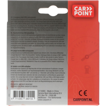 De Carpoint noodverlichting USB oplaadbaar is een veelzijdige en betrouwbare veiligheidslamp voor onderweg. Deze compacte LED-lamp beschikt over drie standen: een opvallend oranje knipperlicht, een wit rondom schijnend standlicht en een gerichte zaklampfunctie. Dankzij de 360° zichtbaarheid en een bereik tot 1 kilometer ben je altijd goed zichtbaar in noodgevallen of pechsituaties. De lamp is eenvoudig op te laden via USB en voorzien van een handige laadindicator. Dankzij de magnetische achterkant bevestig je hem moeiteloos op metalen delen van je voertuig. Bovendien is hij water- en stofbestendig (IP54), ideaal voor gebruik bij alle weersomstandigheden.