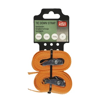 De breekkracht van de Carpoint band is 500 kilogram per stuk, en met deze spanband kunt u lading tot 250 kilogram vastzetten. De breedte van de sjorband is 25 millimeter en wordt in een set van 2 stuks geleverd met TÜV/GS keurmerk.
