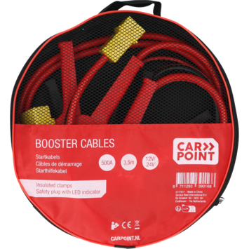 Unieke Carpoint startkabels met gele veiligheidsplug met polariteitsaanduiding. Hierdoor sluit u de startkabels altijd op de juiste polen aan. De startkabel bestaat uit twee delen en zijn kleur gecodeerd (rood en zwart) met aan ieder uiteinde een gele veiligheidsplug met LED indicatie. De startkabels zijn geschikt voor 6, 12 en 24 Volt accu’s en belastbaar tot 500 ampère. De lengte van de startkabel is 3,5 meter. Met koperen klemmen en geïsoleerde handgrepen. Na gebruik de Carpoint startkabels opbergen in de meegeleverde draagtas en in de auto bewaren zodat u de startkabels altijd bij de hand heeft. Aansluiten en werking startkabel/veiligheidsplug: Voordat de veiligheidsplug met elkaar wordt verbonden sluit u eerst de startkabels op het eerste voertuig aan. Klem de rode startkabel op de +pool van de accu en klem de zwarte kabel aan op de -pool van de accu. Gaat de LED indicatie branden dan is de startkabel goed aangesloten. Vervolgens herhaald u deze stap bij het andere voertuig. Als beide LED indicatoren op de gele veiligheidsstekker branden kan er verbinding gemaakt worden door de veiligheidspluggen in elkaar te steken. Vervolgens kan het voertuig met de lege accu gestart worden. Als de auto is gestart de veiligheidsplug uit elkaar halen en de klemmen van de accu halen.