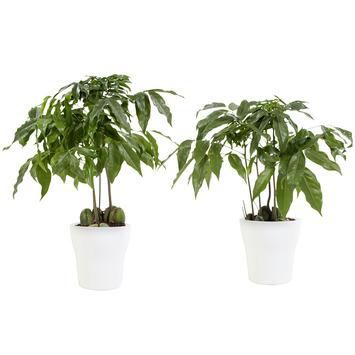 Zijn de 4 planten uit de 4 stuks set of combibox net even teveel? Wellicht is deze set van 2 stuks Australische Kastanjes "Castano" passender. Deze Kastanjeplant groeit met meerdere dezelfde plantjes in één bloempot. De planten hebben een hoogte rond de 30 cm en een potmaat met 12 cm in diameter. In het oorspronkelijke klimaat van deze Australische Kastanje kan hij uitgroeien tot meer dan 20 meter hoog. Binnenshuis blijft deze Castano, met 1 meter hoogte, gelukkig iets meer bescheiden. Je hoeft dus nog geen verbouwingen in gang te brengen. De plant is van zichzelf erg sterk en heeft glimmende bladeren. De Castano groeit met duidelijk zichtbare bonen. De bloempot waar deze Kastanje in groeit heeft een tijdloze witte vormgeving en past daardoor in werkelijk ieder interieur. De bloempot is ook nog eens volledig waterdicht. Je loopt dus geen risico wanneer je deze op een houten tafel plaatst, met naast de pot gieten natuurlijk als uitzoending. Deze Castona is zeker een plant die de aandacht trekt en is ook verkrijgbaar met een grijs- en antraciet gekleurde bloempot.