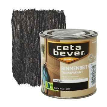 CetaBever binnenbeits transparant black wash zijdeglans 250 ml is een zijdeglans, watergedragen binnenbeits voor al uw houtwerk binnenshuis. CetaBever binnenbeits beschermt hout tegen vlekken, vuil en krassen waardoor het langer mooi blijft. U kunt het gebruiken op kaal of eerder transparant gebeitst hout zoals schroten, deuren, lambriseringen en meubels. De beits is sneldrogend en geurarm. Het geeft hout een transparante kleur waarbij het tegelijkertijd de houtnerf accentueert. De inhoudsmaat is 250 ml.