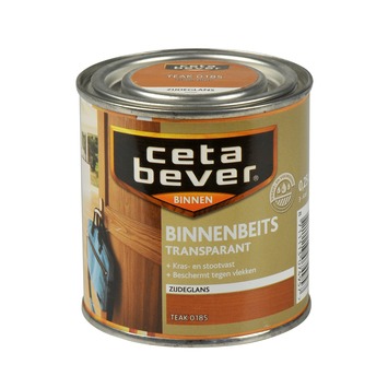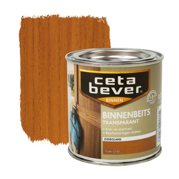 CetaBever binnenbeits transparant teak zijdeglans 250 ml is een zijdeglans, watergedragen binnenbeits voor al uw houtwerk binnenshuis. CetaBever binnenbeits beschermt hout tegen vlekken, vuil en krassen waardoor het langer mooi blijft. U kunt het gebruiken op kaal of eerder transparant gebeitst hout zoals schroten, deuren, lambriseringen en meubels. De beits is sneldrogend en geurarm. Het geeft hout een transparante kleur waarbij het tegelijkertijd de houtnerf accentueert. De inhoudsmaat is 250 ml.