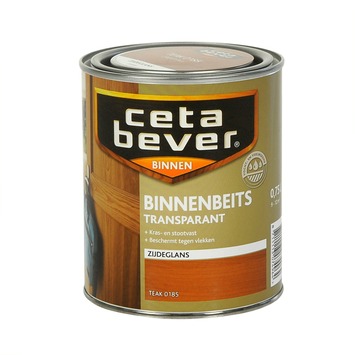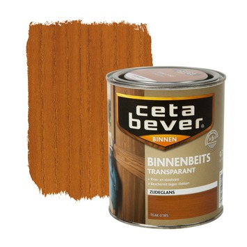 CetaBever binnenbeits transparant teak zijdeglans 750 ml is een zijdeglans, watergedragen binnenbeits voor al uw houtwerk binnenshuis. CetaBever binnenbeits beschermt hout tegen vlekken, vuil en krassen waardoor het langer mooi blijft. U kunt het gebruiken op kaal of eerder transparant gebeitst hout zoals schroten, deuren, lambriseringen en meubels. De beits is sneldrogend en geurarm. Het geeft hout een transparante kleur waarbij het tegelijkertijd de houtnerf accentueert. De inhoudsmaat is 750 ml.