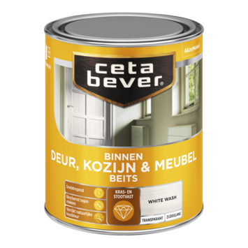 CetaBever Deur, Kozijn & Meubelbeits zijdeglans transparant white wash 750 ml is een watergedragen binnenbeits die een natuurlijke uitstraling aan je hout geeft. Het dringt diep in het hout door, maakt het kras- en stootbestendig en biedt bescherming tegen vlekken. Dankzij de zijdeglans afwerking komt de houtnerf prachtig naar voren en krijgt het hout een mooie, transparante kleur. De beits droogt snel, zodat je snel verder kunt met je klus. Beschikbaar in verschillende kleuren.