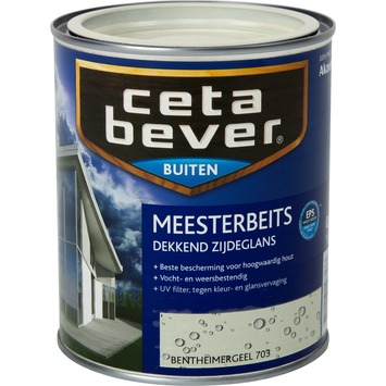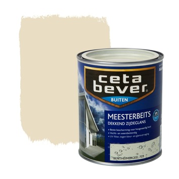 CetaBever meesterbeits dekkend bentheimer geel 750 ml is een zijdeglans, oplosmiddelarme beits voor buiten. CetaBever meesterbeits dekkend beschermt het houtwerk aan huis zoals deuren, kozijnen en luiken. De uitstekende hechting en hoge laagdikte zorgen met minder lagen voor jarenlange bescherming. De meesterbeits bevat een UV-filter waardoor het houtwerk beschermd wordt tegen UV-straling en daardoor langer mooi en zijdeglanzend blijft. Het is vochtregulerend en duurzaam elastisch waardoor de beits de werking van het hout langdurig kan volgen. CetaBever meesterbeits is leverbaar in verschillende dekkende en transparante kleuren. De inhoudsmaat is 750 ml.