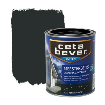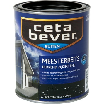 CetaBever meesterbeits dekkend grachtengroen zijdeglans 750 ml is een zijdeglans, oplosmiddelarme beits voor buiten. CetaBever meesterbeits dekkend beschermt het houtwerk aan huis zoals deuren, kozijnen en luiken. De uitstekende hechting en hoge laagdikte zorgen met minder lagen voor jarenlange bescherming. De meesterbeits bevat een UV-filter waardoor het houtwerk beschermd wordt tegen UV-straling en daardoor langer mooi en zijdeglanzend blijft. Het is vochtregulerend en duurzaam elastisch waardoor de beits de werking van het hout langdurig kan volgen. CetaBever meesterbeits is leverbaar in verschillende dekkende en transparante kleuren. De inhoudsmaat is 750 ml.