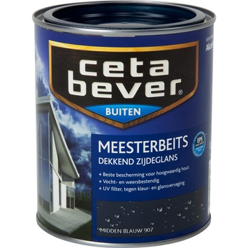 CetaBever meesterbeits dekkend midden blauw zijdeglans 750 ml is een zijdeglans, oplosmiddelarme beits voor buiten. CetaBever meesterbeits dekkend beschermt het houtwerk aan huis zoals deuren, kozijnen en luiken. De uitstekende hechting en hoge laagdikte zorgen met minder lagen voor jarenlange bescherming. De meesterbeits bevat een UV-filter waardoor het houtwerk beschermd wordt tegen UV-straling en daardoor langer mooi en zijdeglanzend blijft. Het is vochtregulerend en duurzaam elastisch waardoor de beits de werking van het hout langdurig kan volgen. CetaBever meesterbeits is leverbaar in verschillende dekkende en transparante kleuren. De inhoudsmaat is 750 ml.