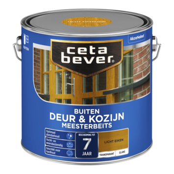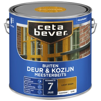 CetaBever Meesterbeits Deur & Kozijn glans transparant licht eiken 2,5 liter is een oplosmiddelhoudende buitenbeits, verkrijgbaar in diverse kleuren in twee verschillende glansgraden: glans en zijdeglans. Transparante Meesterbeits beschermt je hout langdurig tegen weersinvloeden met optimaal glansbehoud. Afhankelijk van de kleur, blootstelling aan zonlicht, de kwaliteit van het hout en het aantal lagen, kan het aantal jaren bescherming afwijken.