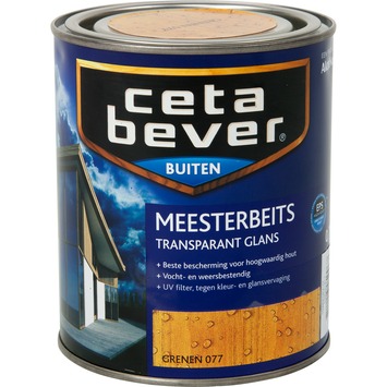 CetaBever meesterbeits UV transparant grenen glans 750 ml is een glanzende, oplosmiddelarme beits voor buiten. CetaBever meesterbeits transparant beschermt het houtwerk aan huis zoals deuren, kozijnen en luiken. De uitstekende hechting en hoge laagdikte zorgen met minder lagen voor jarenlange bescherming. De meesterbeits bevat een UV-filter waardoor het houtwerk beschermd wordt tegen UV-straling en daardoor langer mooi en glanzend blijft. Het is vochtregulerend en duurzaam elastisch waardoor de beits de werking van het hout langdurig kan volgen. CetaBever meesterbeits is leverbaar in verschillende dekkende en transparante kleuren. De inhoudsmaat is 750 ml.