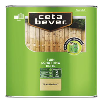 Wil je je schutting goed beschermen? CetaBever Schuttingbeits transparant 2,5 liter is een waterafstotende beits die hout beschermt tegen vocht en weersinvloeden. Deze beits is geschikt voor hard- en zachthout en kan tot 3 jaar bescherming bieden. De beits is verkrijgbaar in verschillende transparante kleuren, zodat je altijd de juiste keuze kunt maken voor jouw tuin. Dankzij de snelle droging kun je vlot doorwerken. Niet geschikt voor gebruik op gelakte oppervlakken. Hoe lang de bescherming precies meegaat, hangt af van de houtsoort, de kleur, zonlicht en het aantal aangebrachte lagen.