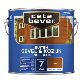 Wil je jouw buitenhout beschermen zonder dat het natuurlijke karakter verloren gaat? CetaBever Snelbeits Gevel & Kozijn zijdemat transparant teak 2,5 liter is een watergedragen beits die speciaal is ontwikkeld voor zachthout en niet-maatvast houtwerk zoals gevelbetimmeringen en rabatdelen. De beits dringt diep in het hout en biedt een vocht- en weerbestendige bescherming tot wel zeven jaar. Dankzij de snelle droogtijd van vier uur kan je eenvoudig meerdere lagen aanbrengen op één dag. Verkrijgbaar in diverse kant-en-klare tinten én te mengen in elke gewenste transparante kleur. Zo creëer je altijd de perfecte uitstraling voor jouw project.