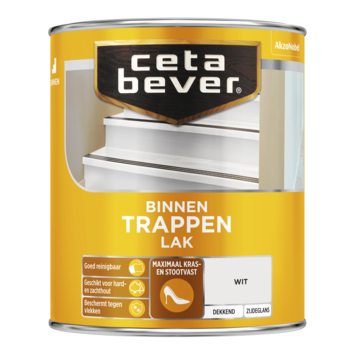 CetaBever Trappenlak dekkend is een watergedragen lak. Het beschermt en verzorgt uw hout en geeft uw hout een prachtige dekkende eindlaag. CetaBever Trappenlak is ook verkrijgbaar als transparante variant.