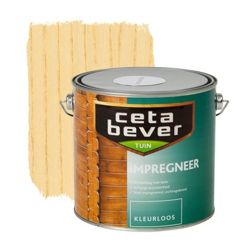 CetaBever Tuin impregneer kleurloos 2,5 liter is een transparant, vochtregulerend impregneermiddel voor buiten. Dit is een uitstekende basislaag voor onder de transparante CetaBever beitsen, ter verhoging van de duurzaamheid. CetaBever impregneer is geschikt voor toepassing op kozijnen, gevelbetimmering, houten stacaravans, blokhutten, schuttingen en ander tuinhout. Het heeft een sterk impregnerende werking en is vochtregulerend waardoor het houtwerk optimaal wordt beschermd. Cetabever impregneer is niet alleen beschermend, maar ook sterk aankleurend waardoor het houtwerk ook mooier maakt. De inhoudsmaat is 2,5 liter.