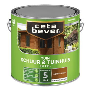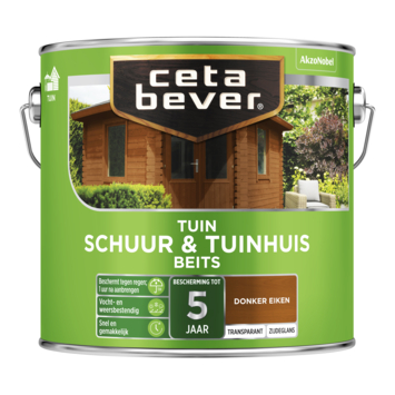 CetaBever Tuinbeits Schuur & Tuinhuis zijdeglans transparant donker eiken 2,5 liter biedt uitstekende bescherming voor je houten schuur of tuinhuis. Deze watergedragen beits vormt een waterdichte afsluiting op de buitenste laag van het hout en is al na 1 uur bestand tegen regen en vocht. Het hout blijft er natuurlijk uitzien door de transparante afwerking die de houtnerf zichtbaar houdt. De formule is vocht- en weersbestendig en biedt tot 5 jaar bescherming. Het is eenvoudig aan te brengen en verkrijgbaar in zowel transparante als dekkende kleuren.