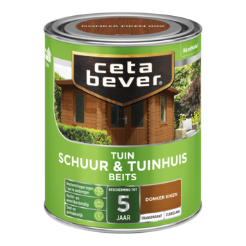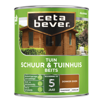 CetaBever Tuinbeits Schuur & Tuinhuis zijdeglans transparant donker eiken 750 ml biedt uitstekende bescherming voor je houten schuur of tuinhuis. Deze watergedragen beits vormt een waterdichte afsluiting op de buitenste laag van het hout en is al na 1 uur bestand tegen regen en vocht. Het hout blijft er natuurlijk uitzien door de transparante afwerking die de houtnerf zichtbaar houdt. De formule is vocht- en weersbestendig en biedt tot 5 jaar bescherming. Het is eenvoudig aan te brengen en verkrijgbaar in zowel transparante als dekkende kleuren.