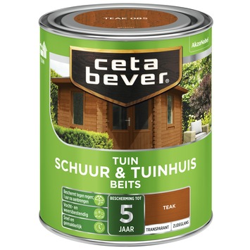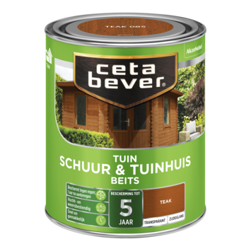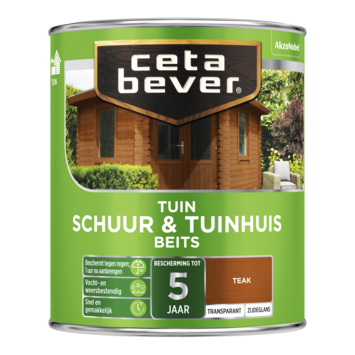 CetaBever Tuinbeits Schuur & Tuinhuis zijdeglans transparant teak 750 ml biedt uitstekende bescherming voor je houten schuur of tuinhuis. Deze watergedragen beits vormt een waterdichte afsluiting op de buitenste laag van het hout en is al na 1 uur bestand tegen regen en vocht. Het hout blijft er natuurlijk uitzien door de transparante afwerking die de houtnerf zichtbaar houdt. De formule is vocht- en weersbestendig en biedt tot 5 jaar bescherming. Het is eenvoudig aan te brengen en verkrijgbaar in zowel transparante als dekkende kleuren.