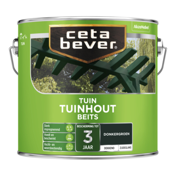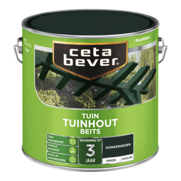 CetaBever Tuinhoutbeits zijdeglans dekkend donkergroen 2,5 liter heeft een sterk impregnerende werking is vochtregulerend, waterafstotend en beschermt het hout van binnen uit. CetaBever Dekkend Tuinhoutbeits is uiterst geschikt voor bescherming van hard- en zachthouten pergola’s, speeltoestellen en ander tuinhout zoals tuinmeubilair en schuttingen. Wij leveren deze beits in mengverf zodat je elke gewenste kleur kunt bestellen, dus ook kleuren van Flexa, Sikkens en Sigma.