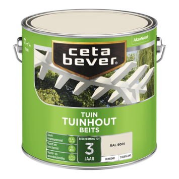 CetaBever Tuinhoutbeits dekkend RAL 9001 crème wit zijdeglans 2,5 liter is een oplosmiddelhoudende tuinbeits, verkrijgbaar in diverse transparante en dekkende kleuren. Dekkende Tuinhoutbeits is te mengen in iedere gewenste kleur. Tuinhoutbeits is sterk impregnerend en voedt en beschermt jouw hout langdurig tegen weersinvloeden.