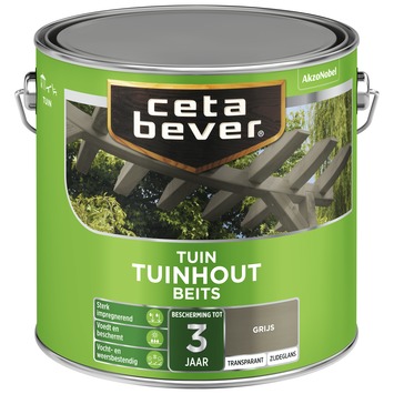 CetaBever Tuinhoutbeits zijdeglans transparant grijs 2,5 liter heeft een sterk impregnerende werking is vochtregulerend, waterafstotend en beschermt het hout van binnen uit. Deze transparante tuinhoutbeits is uiterst geschikt voor bescherming van hard- en zachthouten pergola's, speeltoestellen en ander tuinhout zoals tuinmeubilair en schuttingen. Verkrijgbaar in diverse kant-en-klaar kleuren, maar ook beschikbaar in vele tinten op de mengmachine!