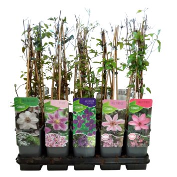 De Clematis mix is een veelzijdige klimplant die met zijn prachtige bloemen in verschillende kleuren elke tuin kan verfraaien. Deze plant bloeit van de lente tot de herfst en is ideaal om muren, hekken of pergola's mee te bedekken, waardoor een sfeervolle en levendige uitstraling ontstaat.