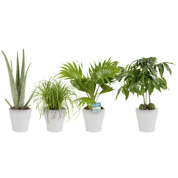 Met deze planten Combibox breng je een zeer diverse selectie aan kamerplanten je woning in. De planten komen met een prachtige matwitte bloempot met een potmaat van 12 cm. Deze combibox bestaat uit een Aloë Vera met een hoogte van 25 cm, een Australische Kastanje met een hoogte van 30 cm, een Waaierpalm met een hoogte van 30 cm en Kattengras met een hoogte van 23 cm. De inbegrepen bloempotten zijn gemaakt van hoogwaardig keramiek en hebben allen een tijdloos design. Je kunt deze potten dus in werkelijk ieder interieur gebruiken en ze zijn verkrijgbaar in wit, grijs en antraciet. Ook zijn de potten volledig waterdicht. Je loopt dus geen risico wanneer je deze op een houten tafel zet, met naast de pot gieten als uitzondering natuurlijk. Je kunt deze 4 planten op verschillende manieren neerzetten. Zet ze allemaal bij elkaar en maak er een prachtig groen hoekje van, maar je kunt ze natuurlijk ook verspreiden!