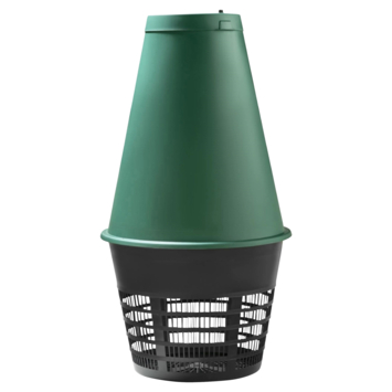 De Green Cone is een voedselafvalvergister op zonne-energie die al het voedselafval efficiënt verwijdert - inclusief gekookt voedsel, vlees, vis (zelfs botten) en zuivelproducten - zonder dat draaien of roeren nodig is. De Green Cone wordt geproduceerd in Groot-Brittannië van 100% gerecycled plastic en heeft een verwachte levensduur van 10 jaar of langer. Ingegraven in een gat in goed doorlatende grond op een zonnige plek, reduceert de Kegel meer dan 90% van zijn inhoud tot voedselrijk water, dat uit de ondergrondse mand wegvloeit en de omliggende grond voedt. Het inbedden van de Cone in de bodem betekent dat de bacteriële vertering onder het maaiveld plaatsvindt, zodat eventuele geuren door de bodem worden geabsorbeerd. In tegenstelling tot de Groene Johanna accepteert de Groene Kegel geen tuinafval en produceert hij geen compost. De Green Cone composter maakt gebruik van zonnewarmte in zijn dubbelwandige kamer om het aerobe afbraakproces in de ondergrondse vergistingskorf te versnellen. De mand moet in een gat van ongeveer 70 cm breed/54 cm diep in goed doorlatende grond (geen klei of krijt) op een zonnige plek in de tuin worden geplaatst. Voedselafval moet rechtstreeks in de kegel worden gegooid, niet in welke soort zak dan ook, zelfs niet in composteerbare zakken. Afval belandt in de ondergrondse mand, waar micro-organismen en wormen binnendringen en het beginnen af ¿¿te breken. Het bovenste deel van de kegel boven de grond blijft leeg: de binnenste en buitenste kegels creëren een warmteval van circulerende lucht die de groei van nuttige micro-organismen vergemakkelijkt en het aerobe verteringsproces bevordert. Er ontstaat een kleine hoeveelheid afvalresten die om de paar jaar kunnen worden geleegd en in de tuingrond kunnen worden gegraven. Een goed gepositioneerde kegel kan het voedselafval van het gemiddelde huishouden verteren. Het regelmatig toevoegen van een beetje versnellerpoeder (een mengsel van natuurlijke bacteriën op graanbasis) is noodzakelijk om het verteringsproces te stimuleren.