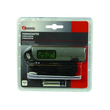 Op de Cosmic autothermometer weersbestendig leest u snel en eenvoudig de temperatuur af. De autothermometer is geschikt voor bevestiging binnen en buiten uw auto. De thermometer is voorzien van 3m klittenband waardoor u deze makkelijk kunt bevestigen. De Cosmic autothermometer weersbestendig heeft een digitaal display waarop u de temperatuur makkelijk kunt aflezen. De thermometer heeft een temperatuurbereik van -50°C tot 50°C en een sensor met 3m kabel. De autothermometer is weersbestendig en werkt op 1 AAA/LR03-batterij die meegeleverd wordt. Kortom, zorg dat u op de hoogte blijft van de actuele temperatuur met de Cosmic autothermometer weerbestendig.