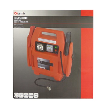 Heeft uw auto een startprobleem? Zorg dat u de Cosmic jumpstarter met compressor 12V in uw kofferbak heeft. De Cosmic jumpstarter met compressor 12V 17Ah met loodzwavelzuurbatterij bestaat uit robuuste heavy duty 400A-klemmen, een compressor van 18bar, noodverlichting, een accumeter met kleurcodering, DC oplaad-LED, een contactdoos voor de oplaadplug, een 230V AC-adapter om het apparaat op te laden en een DC-DC-stroomkabel. De Cosmic jumpstarter met compressor 12V levert een starthulp van 400A met een piek van 900A. De Cosmic Jumpstarter met compressor 12V kan overigens niet alleen gebruikt worden als starthulp, ook kunt u deze gebruiken als krachtige verlichting. Lees de gebruiksaanwijzing goed van te voren.