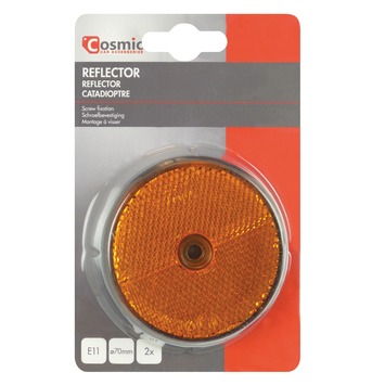 De Cosmic reflectoren schroefbevestiging ø70 mm oranje 2 stuks bevestigt u eenvoudig en snel aan de zijkant van uw aanhangwagen. Het is wettelijk verplicht om goed zichtbaar te zijn in het verkeer. Met reflectoren zorgt u ervoor dat uw aanhangwagen beter wordt opgemerkt. De Cosmic reflectoren schroefbevestiging ø70mm oranje 2 stuks zijn geschikt voor toepassing aan de zijkanten van uw aanhangwagen, caravan en trailer. De oranje reflectoren met een diameter van 70mm hebben een schroefbevestiging, worden per 2 geleverd en voldoen aan de wettelijke eisen. Zorg dat u gezien wordt met de Cosmic reflectoren schroefbevestiging ø70mm oranje 2 stuks.