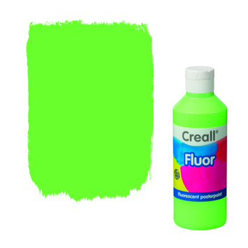 Creall- fluor groen is een fluorescerende plakkaatverf op waterbasis die door extra veel pigment in de verf fel oplichtende kleuren krijgt. De verf is te verdunnen met water en droogt mat op. Om het werkstuk watervast te maken het object aflakken met Creall- varnish. Inhoudsmaat 250 milliliter.